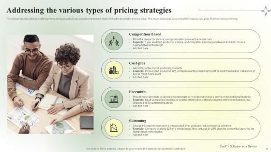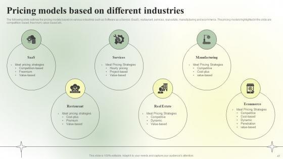 The following slide outlines the pricing models based on various industries such as Software as a Service SaaS, restaurant, services, real estate, manufacturing and ecommerce. The pricing models highlighted in the slide are competition-based, freemium, value-based etc. Coming up with a presentation necessitates that the majority of the effort goes into the content and the message you intend to convey. The visuals of a PowerPoint presentation can only be effective if it supplements and supports the story that is being told. Keeping this in mind our experts created Competitive Branding Strategic Pricing Models Based On Different Guidelines PDF to reduce the time that goes into designing the presentation. This way, you can concentrate on the message while our designers take care of providing you with the right template for the situation. The following slide outlines the pricing models based on various industries such as Software as a Service SaaS, restaurant, services, real estate, manufacturing and ecommerce. The pricing models highlighted in the slide are competition-based, freemium, value-based etc.