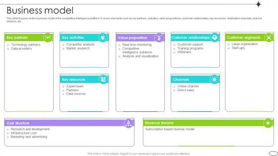 This slide focuses on the business model of the competitive intelligence platform. It covers elements such as key partners, activities, value propositions, customer relationships, key resources, distribution channels, revenue streams, etc. Boost your pitch with our creative Business Model Competitive Landscape Analysis Platform Pitch Deck. Deliver an awe-inspiring pitch that will mesmerize everyone. Using these presentation templates you will surely catch everyones attention. You can browse the ppts collection on our website. We have researchers who are experts at creating the right content for the templates. So you do not have to invest time in any additional work. Just grab the template now and use them. This slide focuses on the business model of the competitive intelligence platform. It covers elements such as key partners, activities, value propositions, customer relationships, key resources, distribution channels, revenue streams, etc.