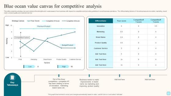 This slide presents a strategy canvas to analyze the strengths and weaknesses of own business with respect to competitors and provides guidelines to excel business operations. The differentiating factors of the enterprises are innovation, marketing, brand name, product quality and customer service. Pitch your topic with ease and precision using this Blue Ocean Value Canvas For Competitive Analysis Mockup Pdf. This layout presents information on Blue Ocean Value Canvas, Competitive Analysis, Product Quality. It is also available for immediate download and adjustment. So, changes can be made in the color, design, graphics or any other component to create a unique layout. This slide presents a strategy canvas to analyze the strengths and weaknesses of own business with respect to competitors and provides guidelines to excel business operations. The differentiating factors of the enterprises are innovation, marketing, brand name, product quality and customer service.