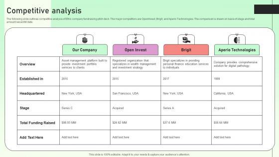 The following slide outlines competitive analysis of Ethic company fundraising pitch deck. The major competitors are OpenInvest, Brigit, and Aperio Technologies. The comparison is drawn on basis of stage and totalamount raised till date. There are so many reasons you need a Competitive Analysis Value Based Investor Financing Pitch Deck Portrait Pdf. The first reason is you can not spend time making everything from scratch, Thus, Slidegeeks has made presentation templates for you too. You can easily download these templates from our website easily. The following slide outlines competitive analysis of Ethic company fundraising pitch deck. The major competitors are OpenInvest, Brigit, and Aperio Technologies. The comparison is drawn on basis of stage and totalamount raised till date.