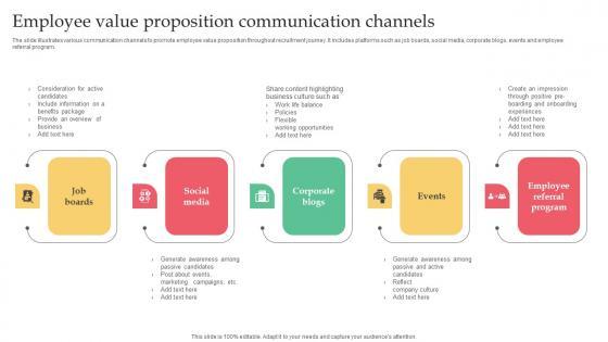 The slide illustrates various communication channels to promote employee value proposition throughout recruitment journey. It includes platforms such as job boards, social media, corporate blogs, events and employee referral program. If you are looking for a format to display your unique thoughts, then the professionally designed Employer Branding Strategy For Competitive Employee Value Proposition Guidelines Pdf is the one for you. You can use it as a Google Slides template or a PowerPoint template. Incorporate impressive visuals, symbols, images, and other charts. Modify or reorganize the text boxes as you desire. Experiment with shade schemes and font pairings. Alter, share or cooperate with other people on your work. Download Employer Branding Strategy For Competitive Employee Value Proposition Guidelines Pdf and find out how to give a successful presentation. Present a perfect display to your team and make your presentation unforgettable. The slide illustrates various communication channels to promote employee value proposition throughout recruitment journey. It includes platforms such as job boards, social media, corporate blogs, events and employee referral program.