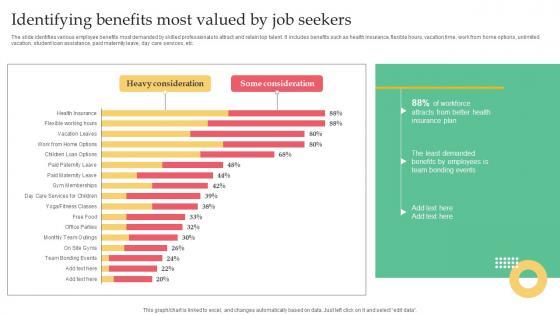The slide identifies various employee benefits most demanded by skilled professionals to attract and retain top talent. It includes benefits such as health insurance, flexible hours, vacation time, work from home options, unlimited vacation, student loan assistance, paid maternity leave, day care services, etc. Formulating a presentation can take up a lot of effort and time, so the content and message should always be the primary focus. The visuals of the PowerPoint can enhance the presenters message, so our Employer Branding Strategy For Competitive Identifying Benefits Most Valued By Job Infographics Pdf was created to help save time. Instead of worrying about the design, the presenter can concentrate on the message while our designers work on creating the ideal templates for whatever situation is needed. Slidegeeks has experts for everything from amazing designs to valuable content, we have put everything into Employer Branding Strategy For Competitive Identifying Benefits Most Valued By Job Infographics Pdf. The slide identifies various employee benefits most demanded by skilled professionals to attract and retain top talent. It includes benefits such as health insurance, flexible hours, vacation time, work from home options, unlimited vacation, student loan assistance, paid maternity leave, day care services, etc.