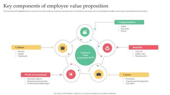 The following slide highlighting five key areas to focus while creating an employee value proposition. It includes key elements such as compensation, benefits, environment, career development and culture. The Employer Branding Strategy For Competitive Key Components Of Employee Value Formats Pdf is a compilation of the most recent design trends as a series of slides. It is suitable for any subject or industry presentation, containing attractive visuals and photo spots for businesses to clearly express their messages. This template contains a variety of slides for the user to input data, such as structures to contrast two elements, bullet points, and slides for written information. Slidegeeks is prepared to create an impression. The following slide highlighting five key areas to focus while creating an employee value proposition. It includes key elements such as compensation, benefits, environment, career development and culture.