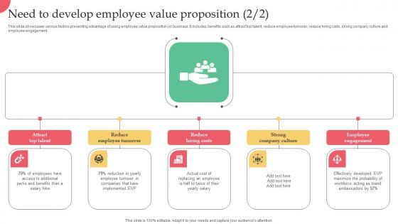 This slide showcases various factors presenting advantage of using employee value proposition on business. It includes benefits such as attract highly skilled professionals, retain top talent, optimize recruitment expenses, enhance corporate culture and improves employees experience. Slidegeeks has constructed Employer Branding Strategy For Competitive Need To Develop Employee Value Sample Pdf after conducting extensive research and examination. These presentation templates are constantly being generated and modified based on user preferences and critiques from editors. Here, you will find the most attractive templates for a range of purposes while taking into account ratings and remarks from users regarding the content. This is an excellent jumping-off point to explore our content and will give new users an insight into our top-notch PowerPoint Templates. This slide showcases various factors presenting advantage of using employee value proposition on business. It includes benefits such as attract highly skilled professionals, retain top talent, optimize recruitment expenses, enhance corporate culture and improves employees experience.