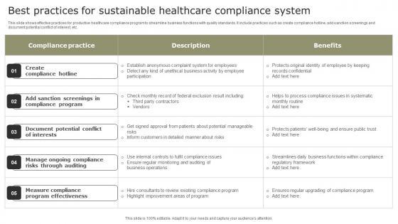 This slide shows effective practices for productive healthcare compliance program to streamline business functions with quality standards. It include practices such as create compliance hotline, add sanction screenings and document potential conflict of interest, etc. Pitch your topic with ease and precision using this Best Practices For Sustainable Healthcare Compliance System Infographics Pdf. This layout presents information on Create Compliance Hotline, Document Potential, Ongoing Compliance. It is also available for immediate download and adjustment. So, changes can be made in the color, design, graphics or any other component to create a unique layout. This slide shows effective practices for productive healthcare compliance program to streamline business functions with quality standards. It include practices such as create compliance hotline, add sanction screenings and document potential conflict of interest, etc.
