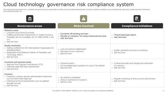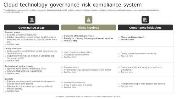 This slide shows governance risk compliance program for cloud based entity to identify and eliminate potential threats. It include compliance initiatives such as threat landscape report, quality standards assurance and contractual audits, etc. Showcasing this set of slides titled Cloud Technology Governance Risk Compliance System Template Pdf. The topics addressed in these templates are Governance Areas, Risks Involved, Compliance Initiatives. All the content presented in this PPT design is completely editable. Download it and make adjustments in color, background, font etc. as per your unique business setting. This slide shows governance risk compliance program for cloud based entity to identify and eliminate potential threats. It include compliance initiatives such as threat landscape report, quality standards assurance and contractual audits, etc.