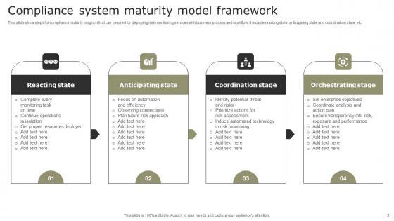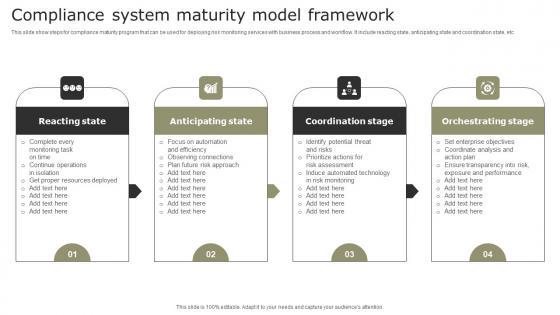 This slide show steps for compliance maturity program that can be used for deploying risk monitoring services with business process and workflow. It include reacting state, anticipating state and coordination state, etc. Showcasing this set of slides titled Compliance System Maturity Model Framework Icons Pdf. The topics addressed in these templates are Reacting State, Anticipating State, Coordination Stage. All the content presented in this PPT design is completely editable. Download it and make adjustments in color, background, font etc. as per your unique business setting. This slide show steps for compliance maturity program that can be used for deploying risk monitoring services with business process and workflow. It include reacting state, anticipating state and coordination state, etc.