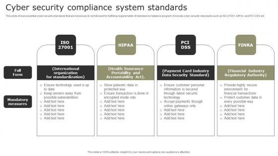This slide shows essential cyber security standards that are necessary to be followed for fulfilling requirements of standard compliance program. It include cyber security standards such as ISO 27001, HIPAA and PCI DSS etc. Showcasing this set of slides titled Cyber Security Compliance System Standards Demonstration Pdf. The topics addressed in these templates are International Organization, Health Insurance, Payment Card Industry. All the content presented in this PPT design is completely editable. Download it and make adjustments in color, background, font etc. as per your unique business setting. This slide shows essential cyber security standards that are necessary to be followed for fulfilling requirements of standard compliance program. It include cyber security standards such as ISO 27001, HIPAA and PCI DSS etc.