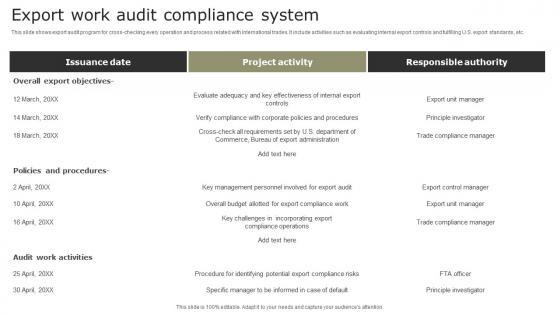 This slide shows export audit program for cross-checking every operation and process related with international trades. It include activities such as evaluating internal export controls and fulfilling U.S. export standards, etc. Pitch your topic with ease and precision using this Export Work Audit Compliance System Formats Pdf. This layout presents information on Issuance Date, Project Activity, Responsible Authority. It is also available for immediate download and adjustment. So, changes can be made in the color, design, graphics or any other component to create a unique layout. This slide shows export audit program for cross-checking every operation and process related with international trades. It include activities such as evaluating internal export controls and fulfilling U.S. export standards, etc.