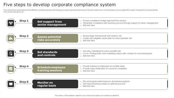 This slide shows crucial steps to build effective compliance program for following company standard and protocols to prevent certain risks. It include steps such as support from upper management, assess potential risks ad sets standards, etc. Showcasing this set of slides titled Five Steps To Develop Corporate Compliance System Background Pdf. The topics addressed in these templates are Senior Management, Assess Potential Risks Accurately, Standards And Controls. All the content presented in this PPT design is completely editable. Download it and make adjustments in color, background, font etc. as per your unique business setting. This slide shows crucial steps to build effective compliance program for following company standard and protocols to prevent certain risks. It include steps such as support from upper management, assess potential risks ad sets standards, etc.