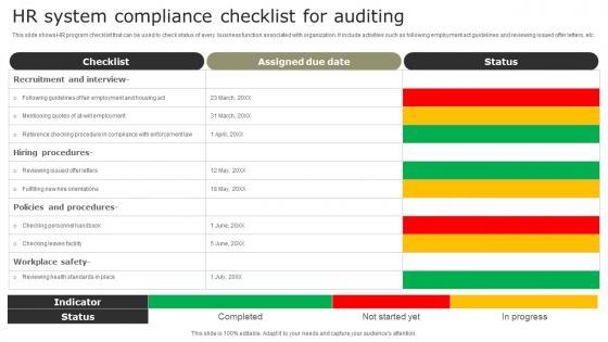 This slide shows HR program checklist that can be used to check status of every business function associated with organization. It include activities such as following employment act guidelines and reviewing issued offer letters, etc. Pitch your topic with ease and precision using this HR System Compliance Checklist For Auditing Background Pdf. This layout presents information on Checklist, Assigned Due Date. It is also available for immediate download and adjustment. So, changes can be made in the color, design, graphics or any other component to create a unique layout. This slide shows HR program checklist that can be used to check status of every business function associated with organization. It include activities such as following employment act guidelines and reviewing issued offer letters, etc.