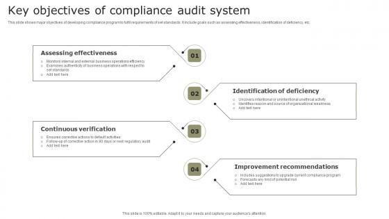 This slide shows major objectives of developing compliance program to fulfil requirements of set standards. It include goals such as assessing effectiveness, identification of deficiency, etc. Showcasing this set of slides titled Key Objectives Of Compliance Audit System Pictures Pdf. The topics addressed in these templates are Assessing Effectiveness, Continuous Verification, Identification Of Deficiency. All the content presented in this PPT design is completely editable. Download it and make adjustments in color, background, font etc. as per your unique business setting. This slide shows major objectives of developing compliance program to fulfil requirements of set standards. It include goals such as assessing effectiveness, identification of deficiency, etc.