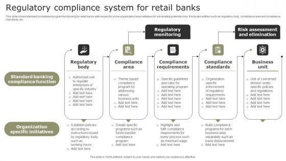 This slide shows standard compliance program functioning for retail banks with respect to some organization level initiatives for eliminating potential risks. It includes entities such as regulatory body, compliance area and compliance standards, etc. Showcasing this set of slides titled Regulatory Compliance System For Retail Banks Infographics Pdf. The topics addressed in these templates are Regulatory Body, Compliance Area, Compliance Standards. All the content presented in this PPT design is completely editable. Download it and make adjustments in color, background, font etc. as per your unique business setting. This slide shows standard compliance program functioning for retail banks with respect to some organization level initiatives for eliminating potential risks. It includes entities such as regulatory body, compliance area and compliance standards, etc.