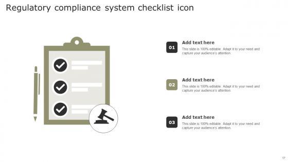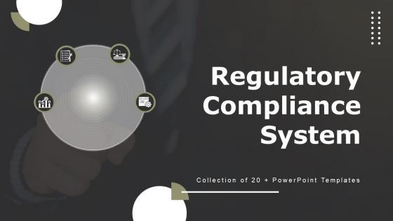 Improve your presentation delivery using this Regulatory Compliance System Ppt Powerpoint Presentation Complete Deck With Slides. Support your business vision and objectives using this well-structured PPT deck. This template offers a great starting point for delivering beautifully designed presentations on the topic of your choice. Comprising twenty this professionally designed template is all you need to host discussion and meetings with collaborators. Each slide is self-explanatory and equipped with high-quality graphics that can be adjusted to your needs. Therefore, you will face no difficulty in portraying your desired content using this PPT slideshow. This PowerPoint slideshow contains every important element that you need for a great pitch. It is not only editable but also available for immediate download and utilization. The color, font size, background, shapes everything can be modified to create your unique presentation layout. Therefore, download it now. Our Regulatory Compliance System Ppt Powerpoint Presentation Complete Deck With Slides are topically designed to provide an attractive backdrop to any subject. Use them to look like a presentation pro.