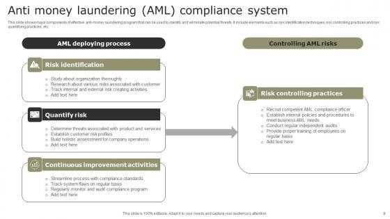 This slide shows major components of effective anti-money laundering program that can be used to identify and eliminate potential threats. It include elements such as risk identification techniques, risk controlling practices and risk quantifying practices, etc. Showcasing this set of slides titled Anti Money Laundering AML Compliance System Infographics Pdf. The topics addressed in these templates are Risk Identification, Quantify Risk, Continuous Improvement Activities. All the content presented in this PPT design is completely editable. Download it and make adjustments in color, background, font etc. as per your unique business setting. This slide shows major components of effective anti-money laundering program that can be used to identify and eliminate potential threats. It include elements such as risk identification techniques, risk controlling practices and risk quantifying practices, etc.