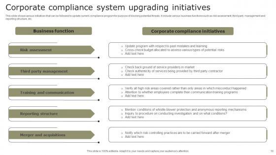 This slide shows various initiatives that can be followed to update current compliance program for purpose of blocking potential threats. It include various business functions such as risk assessment, third party management and reporting structure, etc. Pitch your topic with ease and precision using this Corporate Compliance System Upgrading Initiatives Rules Pdf. This layout presents information on Risk Assessment, Third Party Management, Training And Communication. It is also available for immediate download and adjustment. So, changes can be made in the color, design, graphics or any other component to create a unique layout. This slide shows various initiatives that can be followed to update current compliance program for purpose of blocking potential threats. It include various business functions such as risk assessment, third party management and reporting structure, etc.