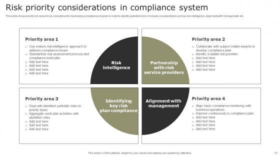 This slide shows priority risk areas to be considered for developing compliance program in order to identify potential risks. It include considerations such as risk intelligence, alignment with management, etc. Pitch your topic with ease and precision using this Risk Priority Considerations In Compliance System Designs Pdf. This layout presents information on Risk Intelligence, Identifying Key Risk, Alignment With Management. It is also available for immediate download and adjustment. So, changes can be made in the color, design, graphics or any other component to create a unique layout. This slide shows priority risk areas to be considered for developing compliance program in order to identify potential risks. It include considerations such as risk intelligence, alignment with management, etc.
