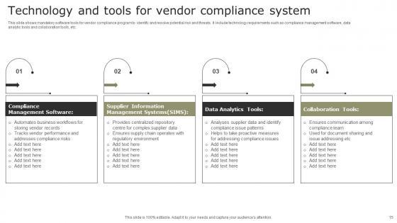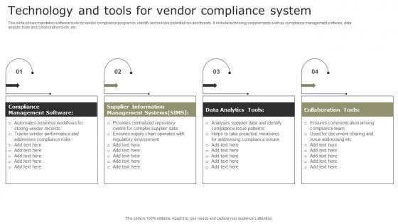 This slide shows mandatory software tools for vendor compliance program to identify and resolve potential risk and threats. It include technology requirements such as compliance management software, data analytic tools and collaboration tools, etc. Pitch your topic with ease and precision using this Technology And Tools For Vendor Compliance System Pictures Pdf. This layout presents information on Compliance Management Software, Data Analytics Tools, Collaboration Tools. It is also available for immediate download and adjustment. So, changes can be made in the color, design, graphics or any other component to create a unique layout. This slide shows mandatory software tools for vendor compliance program to identify and resolve potential risk and threats. It include technology requirements such as compliance management software, data analytic tools and collaboration tools, etc.