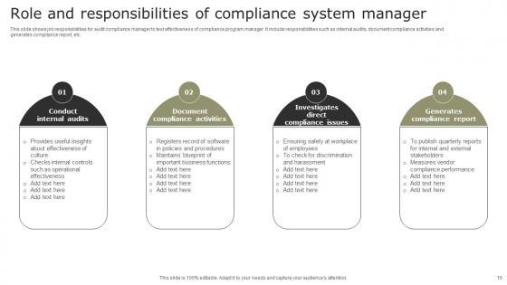This slide shows job responsibilities for audit compliance manager to test effectiveness of compliance program manager. It include responsibilities such as internal audits, document compliance activities and generates compliance report, etc. Showcasing this set of slides titled Role And Responsibilities Of Compliance System Manager Topics Pdf. The topics addressed in these templates are Conduct Internal Audits, Document Compliance Activities, Generates Compliance Report. All the content presented in this PPT design is completely editable. Download it and make adjustments in color, background, font etc. as per your unique business setting. This slide shows job responsibilities for audit compliance manager to test effectiveness of compliance program manager. It include responsibilities such as internal audits, document compliance activities and generates compliance report, etc.