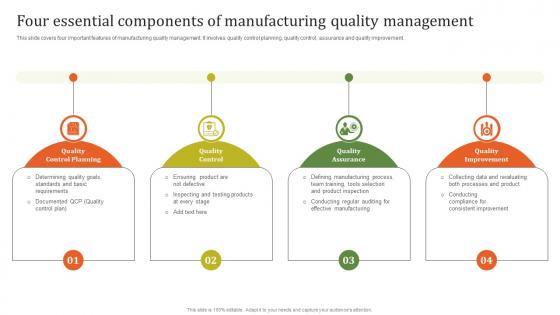 This slide covers four important features of manufacturing quality management. It involves quality control planning, quality control, assurance and quality improvement. Are you in need of a template that can accommodate all of your creative concepts This one is crafted professionally and can be altered to fit any style. Use it with Google Slides or PowerPoint. Include striking photographs, symbols, depictions, and other visuals. Fill, move around, or remove text boxes as desired. Test out color palettes and font mixtures. Edit and save your work, or work with colleagues. Download Four Essential Components Of Executing Effective Quality Enhancement Template Pdf and observe how to make your presentation outstanding. Give an impeccable presentation to your group and make your presentation unforgettable. This slide covers four important features of manufacturing quality management. It involves quality control planning, quality control, assurance and quality improvement.