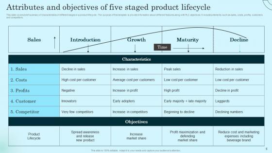 This slide covers brief summary of characteristics of different stages in a product lifecycle . The purpose of this template is provide information about different features along with PLC objectives. It includes elements such as sales, costs, profits, customers and competitors. Boost your pitch with our creative Attributes And Objectives Of Five Staged Comprehensive Guide To Product Lifecycle Designs Pdf. Deliver an awe inspiring pitch that will mesmerize everyone. Using these presentation templates you will surely catch everyones attention. You can browse the ppts collection on our website. We have researchers who are experts at creating the right content for the templates. So you do not have to invest time in any additional work. Just grab the template now and use them. This slide covers brief summary of characteristics of different stages in a product lifecycle . The purpose of this template is provide information about different features along with PLC objectives. It includes elements such as sales, costs, profits, customers and competitors.