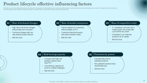 This slide covers factors determining the product lifecycle. The purpose of this template is to provide information based on several factors that improves the sales of a product. It includes factors such as rate of technical changes, rate of market acceptance, ease of competitive entry, risk bearing capacity, protection by patent, etc. Are you searching for a Product Lifecycle Effective Influencing Factors Comprehensive Guide To Product Lifecycle Icons Pdf that is uncluttered, straightforward, and original Its easy to edit, and you can change the colors to suit your personal or business branding. For a presentation that expresses how much effort you have put in, this template is ideal With all of its features, including tables, diagrams, statistics, and lists, its perfect for a business plan presentation. Make your ideas more appealing with these professional slides. Download Product Lifecycle Effective Influencing Factors Comprehensive Guide To Product Lifecycle Icons Pdf from Slidegeeks today. This slide covers factors determining the product lifecycle. The purpose of this template is to provide information based on several factors that improves the sales of a product. It includes factors such as rate of technical changes, rate of market acceptance, ease of competitive entry, risk bearing capacity, protection by patent, etc.