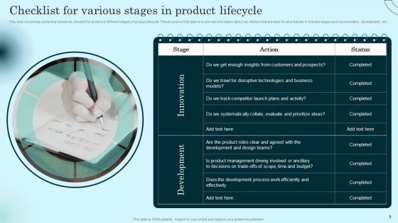 This slide covers key points that should be checked for product in different stages of product lifecycle. This purpose of this slide is to provide information about key factors that are must for all products. It includes stages such as innovation, development, etc. Want to ace your presentation in front of a live audience Our Checklist For Various Stages In Product Lifecycle Comprehensive Guide To Product Lifecycle Diagrams Pdf can help you do that by engaging all the users towards you. Slidegeeks experts have put their efforts and expertise into creating these impeccable powerpoint presentations so that you can communicate your ideas clearly. Moreover, all the templates are customizable, and easy to edit and downloadable. Use these for both personal and commercial use. This slide covers key points that should be checked for product in different stages of product lifecycle. This purpose of this slide is to provide information about key factors that are must for all products. It includes stages such as innovation, development, etc.