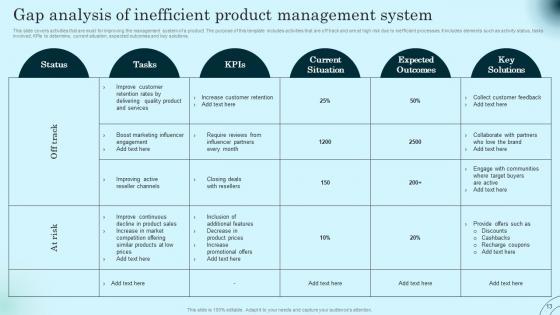 This slide covers activities that are must for improving the management system of a product. The purpose of this template includes activities that are off track and are at high risk due to inefficient processes. It includes elements such as activity status, tasks involved, KPIs to determine, current situation, expected outcomes and key solutions. If your project calls for a presentation, then Slidegeeks is your go to partner because we have professionally designed, easy to edit templates that are perfect for any presentation. After downloading, you can easily edit Gap Analysis Of Inefficient Product Management Comprehensive Guide To Product Lifecycle Elements Pdf and make the changes accordingly. You can rearrange slides or fill them with different images. Check out all the handy templates This slide covers activities that are must for improving the management system of a product. The purpose of this template includes activities that are off track and are at high risk due to inefficient processes. It includes elements such as activity status, tasks involved, KPIs to determine, current situation, expected outcomes and key solutions.