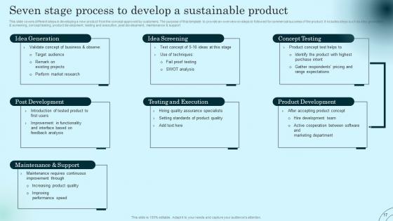 This slide covers different steps in developing a new product from the concept approved by customers. The purpose of this template to provide an overview on steps to followed for commercial success of the product. It includes steps such as idea generation and screening, concept testing, product development, testing and execution, post development, maintenance and support This Seven Stage Process To Develop A Sustainable Comprehensive Guide To Product Lifecycle Information Pdf from Slidegeeks makes it easy to present information on your topic with precision. It provides customization options, so you can make changes to the colors, design, graphics, or any other component to create a unique layout. It is also available for immediate download, so you can begin using it right away. Slidegeeks has done good research to ensure that you have everything you need to make your presentation stand out. Make a name out there for a brilliant performance. This slide covers different steps in developing a new product from the concept approved by customers. The purpose of this template to provide an overview on steps to followed for commercial success of the product. It includes steps such as idea generation and screening, concept testing, product development, testing and execution, post development, maintenance and support.