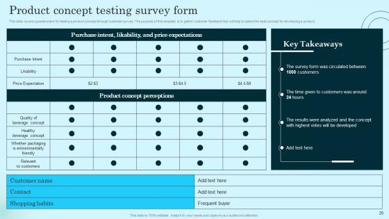 This slide covers analysis of results generated through customer survey. The purpose of this template is to provide customers feedback on purchase intent, price sensitivity, likability, etc. Do you have an important presentation coming up Are you looking for something that will make your presentation stand out from the rest Look no further than Evaluation Of Product Concept Testing Survey Comprehensive Guide To Product Lifecycle Slides Pdf. With our professional designs, you can trust that your presentation will pop and make delivering it a smooth process. And with Slidegeeks, you can trust that your presentation will be unique and memorable. So why wait Grab Evaluation Of Product Concept Testing Survey Comprehensive Guide To Product Lifecycle Slides Pdf today and make your presentation stand out from the rest This slide covers analysis of results generated through customer survey. The purpose of this template is to provide customers feedback on purchase intent, price sensitivity, likability, etc.