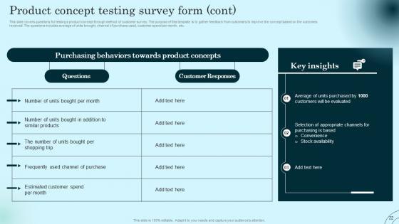 This slide covers questionnaire for testing a product concept through customer survey. The purpose of this template is to gather customer feedback that will help to select the best concept for developing a product. Explore a selection of the finest Product Concept Testing Survey Form Comprehensive Guide To Product Lifecycle Professional Pdf here. With a plethora of professionally designed and pre made slide templates, you can quickly and easily find the right one for your upcoming presentation. You can use our Product Concept Testing Survey Form Comprehensive Guide To Product Lifecycle Professional Pdf to effectively convey your message to a wider audience. Slidegeeks has done a lot of research before preparing these presentation templates. The content can be personalized and the slides are highly editable. Grab templates today from Slidegeeks. This slide covers questionnaire for testing a product concept through customer survey. The purpose of this template is to gather customer feedback that will help to select the best concept for developing a product.