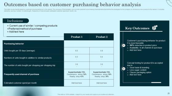 This slide coves results based on customers buying behavior in the market. The purpose of this template is to provide customers purchasing characteristics that define the strategies for the company to introduce a new product in the market. It includes elements, such as number of units bought, frequency of channel used, estimated customer spend per month, etc. Welcome to our selection of the Outcomes Based On Customer Purchasing Comprehensive Guide To Product Lifecycle Information Pdf. These are designed to help you showcase your creativity and bring your sphere to life. Planning and Innovation are essential for any business that is just starting out. This collection contains the designs that you need for your everyday presentations. All of our PowerPoints are 100 percent editable, so you can customize them to suit your needs. This multi purpose template can be used in various situations. Grab these presentation templates today This slide coves results based on customers buying behavior in the market. The purpose of this template is to provide customers purchasing characteristics that define the strategies for the company to introduce a new product in the market. It includes elements, such as number of units bought, frequency of channel used, estimated customer spend per month, etc.