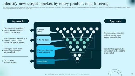 This slide covers approaches to define new target markets through idea filtering process. The purpose of this slide is to provide key activities to be included while determining audience for the product. It includes stages such as generation of ideas, filtering ideas, market feedback based filtering, go to market, etc. Crafting an eye catching presentation has never been more straightforward. Let your presentation shine with this tasteful yet straightforward Identify New Target Market By Entry Product Idea Comprehensive Guide To Product Lifecycle Introduction Pdf template. It offers a minimalistic and classy look that is great for making a statement. The colors have been employed intelligently to add a bit of playfulness while still remaining professional. Construct the ideal Identify New Target Market By Entry Product Idea Comprehensive Guide To Product Lifecycle Introduction Pdf that effortlessly grabs the attention of your audience Begin now and be certain to wow your customers This slide covers approaches to define new target markets through idea filtering process. The purpose of this slide is to provide key activities to be included while determining audience for the product. It includes stages such as generation of ideas, filtering ideas, market feedback based filtering, go to market, etc.