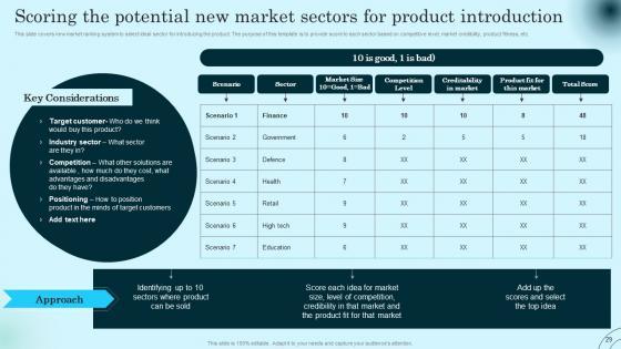 This slide covers new market ranking system to select ideal sector for introducing the product. The purpose of this template is to provide score to each sector based on competitive level, market credibility, product fitness, etc. Here you can discover an assortment of the finest PowerPoint and Google Slides templates. With these templates, you can create presentations for a variety of purposes while simultaneously providing your audience with an eye catching visual experience. Download Scoring The Potential New Market Sectors Comprehensive Guide To Product Lifecycle Introduction Pdf to deliver an impeccable presentation. These templates will make your job of preparing presentations much quicker, yet still, maintain a high level of quality. Slidegeeks has experienced researchers who prepare these templates and write high quality content for you. Later on, you can personalize the content by editing the Scoring The Potential New Market Sectors Comprehensive Guide To Product Lifecycle Introduction Pdf. This slide covers new market ranking system to select ideal sector for introducing the product. The purpose of this template is to provide score to each sector based on competitive level, market credibility, product fitness, etc.