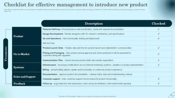 This slide provides information for product launch checklist catering key tasks related to product, go to market, systems, sales and support, feedback. It includes features defining, pricing and packaging, customer support, billing, etc. Slidegeeks is one of the best resources for PowerPoint templates. You can download easily and regulate Checklist For Effective Management Comprehensive Guide To Product Lifecycle Inspiration Pdf for your personal presentations from our wonderful collection. A few clicks is all it takes to discover and get the most relevant and appropriate templates. Use our Templates to add a unique zing and appeal to your presentation and meetings. All the slides are easy to edit and you can use them even for advertisement purposes. This slide provides information for product launch checklist catering key tasks related to product, go to market, systems, sales and support, feedback. It includes features defining, pricing and packaging, customer support, billing, etc.