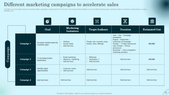 This slide covers information based on launching multiple campaigns to expand market for the product. The purpose of this template is to provide details regarding goals, marketing initiatives undertaken, target audience, duration, estimated cost. Slidegeeks is here to make your presentations a breeze with Different Marketing Campaigns To Accelerate Comprehensive Guide To Product Lifecycle Infographics Pdf With our easy to use and customizable templates, you can focus on delivering your ideas rather than worrying about formatting. With a variety of designs to choose from, you are sure to find one that suits your needs. And with animations and unique photos, illustrations, and fonts, you can make your presentation pop. So whether you are giving a sales pitch or presenting to the board, make sure to check out Slidegeeks first This slide covers information based on launching multiple campaigns to expand market for the product. The purpose of this template is to provide details regarding goals, marketing initiatives undertaken, target audience, duration, estimated cost.