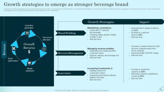 This slide covers key techniques to improve brands performance and make it a powerful product of the company. The purpose of this template is to provide ways to help in building brand value, management of revenue and innovation. It also includes impact of strategies on the increasing market share and customer base along with overall returns. Are you in need of a template that can accommodate all of your creative concepts This one is crafted professionally and can be altered to fit any style. Use it with Google Slides or PowerPoint. Include striking photographs, symbols, depictions, and other visuals. Fill, move around, or remove text boxes as desired. Test out color palettes and font mixtures. Edit and save your work, or work with colleagues. Download Growth Strategies To Emerge As Stronger Beverage Comprehensive Guide To Product Lifecycle Ideas Pdf and observe how to make your presentation outstanding. Give an impeccable presentation to your group and make your presentation unforgettable. This slide covers key techniques to improve brands performance and make it a powerful product of the company. The purpose of this template is to provide ways to help in building brand value, management of revenue and innovation. It also includes impact of strategies on the increasing market share and customer base along with overall returns.