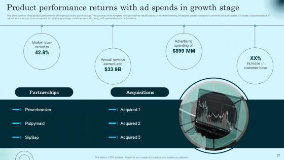 This slide covers overall product performance of the product in the growth stage. The purpose of this template is to provide key results based on several marketing strategies used by company to promote products sales. It includes outcomes based on market share, annual revenue earned, advertising spendings, customer base, etc. along with partnerships and acquisitions. Slidegeeks has constructed Product Performance Returns With Ad Spends Comprehensive Guide To Product Lifecycle Diagrams Pdf after conducting extensive research and examination. These presentation templates are constantly being generated and modified based on user preferences and critiques from editors. Here, you will find the most attractive templates for a range of purposes while taking into account ratings and remarks from users regarding the content. This is an excellent jumping off point to explore our content and will give new users an insight into our top notch PowerPoint Templates. This slide covers overall product performance of the product in the growth stage. The purpose of this template is to provide key results based on several marketing strategies used by company to promote products sales. It includes outcomes based on market share, annual revenue earned, advertising spendings, customer base, etc. along with partnerships and acquisitions.