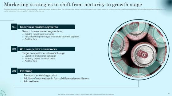 This slide covers key techniques to improve sales of a product already at a maturity stage. The purpose of this slide is to provide several ways to expand market for the product and increase demands and sales. It includes strategies such as entering new market segment, winning competitors customers, flanking, etc. This Marketing Strategies To Shift From Maturity Comprehensive Guide To Product Lifecycle Formats Pdf is perfect for any presentation, be it in front of clients or colleagues. It is a versatile and stylish solution for organizing your meetings. The Marketing Strategies To Shift From Maturity Comprehensive Guide To Product Lifecycle Formats Pdf features a modern design for your presentation meetings. The adjustable and customizable slides provide unlimited possibilities for acing up your presentation. Slidegeeks has done all the homework before launching the product for you. So, do not wait, grab the presentation templates today This slide covers key techniques to improve sales of a product already at a maturity stage. The purpose of this slide is to provide several ways to expand market for the product and increase demands and sales. It includes strategies such as entering new market segment, winning competitors customers, flanking, etc.