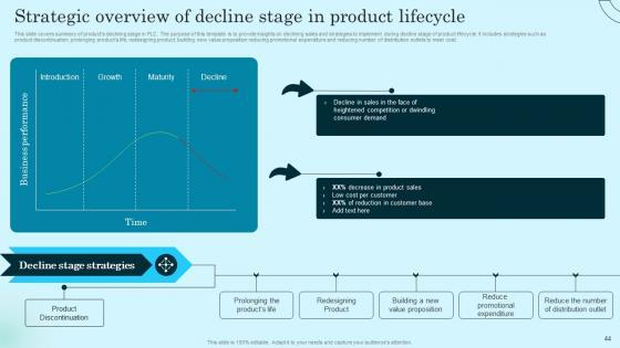 This slide covers summary of products declining stage in PLC. The purpose of this template is to provide insights on declining sales and strategies to implement during decline stage of product lifecycle. It includes strategies such as product discontinuation, prolonging products life, redesigning product, building new value proposition reducing promotional expenditure and reducing number of distribution outlets to meet cost. Do you know about Slidesgeeks Strategic Overview Of Decline Stage In Product Comprehensive Guide To Product Lifecycle Inspiration Pdf These are perfect for delivering any kind od presentation. Using it, create PowerPoint presentations that communicate your ideas and engage audiences. Save time and effort by using our pre designed presentation templates that are perfect for a wide range of topic. Our vast selection of designs covers a range of styles, from creative to business, and are all highly customizable and easy to edit. Download as a PowerPoint template or use them as Google Slides themes. This slide covers summary of products declining stage in PLC. The purpose of this template is to provide insights on declining sales and strategies to implement during decline stage of product lifecycle. It includes strategies such as product discontinuation, prolonging products life, redesigning product, building new value proposition reducing promotional expenditure and reducing number of distribution outlets to meet cost.