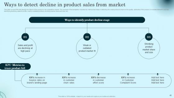 This slide covers KPIs that identify the failure of the product in the competitive market. The purpose of this templates includes key metrics that helps in detecting the weak product to improve the quality, attributes of the product. It includes elements such as identifying declining sales and profits, week or outdated product, shrinking market share and size, etc. Slidegeeks is one of the best resources for PowerPoint templates. You can download easily and regulate Ways To Detect Decline In Product Sales From Market Comprehensive Guide To Product Lifecycle Elements Pdf for your personal presentations from our wonderful collection. A few clicks is all it takes to discover and get the most relevant and appropriate templates. Use our Templates to add a unique zing and appeal to your presentation and meetings. All the slides are easy to edit and you can use them even for advertisement purposes. This slide covers KPIs that identify the failure of the product in the competitive market. The purpose of this templates includes key metrics that helps in detecting the weak product to improve the quality, attributes of the product. It includes elements such as identifying declining sales and profits, week or outdated product, shrinking market share and size, etc.