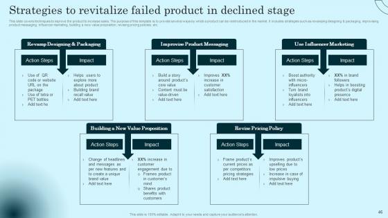 This slide covers techniques to improve the product to increase sales. The purpose of this template is to provide several ways by which a product can be reintroduced in the market. It includes strategies such as revamping designing and packaging, improvising product messaging, influencer marketing, building a new value proposition, revising pricing policies, etc. Find a pre designed and impeccable Strategies To Revitalize Failed Product In Declined Comprehensive Guide To Product Lifecycle Clipart Pdf. The templates can ace your presentation without additional effort. You can download these easy to edit presentation templates to make your presentation stand out from others. So, what are you waiting for Download the template from Slidegeeks today and give a unique touch to your presentation. This slide covers techniques to improve the product to increase sales. The purpose of this template is to provide several ways by which a product can be reintroduced in the market. It includes strategies such as revamping designing and packaging, improvising product messaging, influencer marketing, building a new value proposition, revising pricing policies, etc.