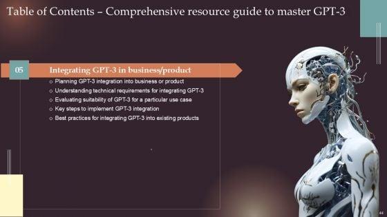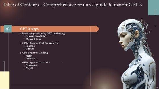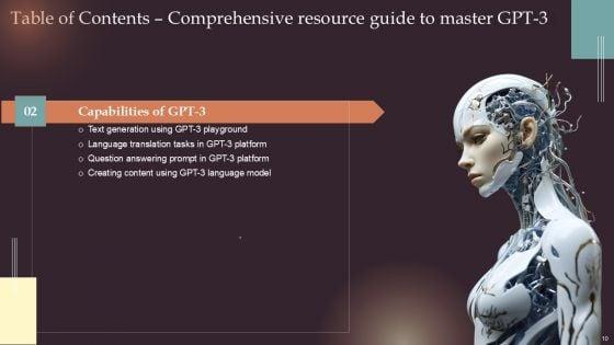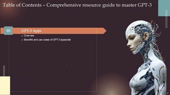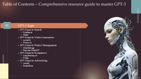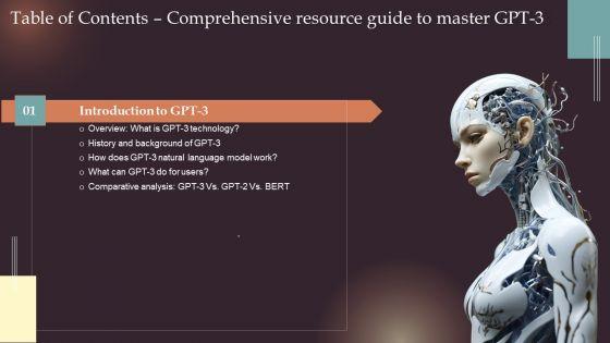 Slidegeeks is one of the best resources for PowerPoint templates. You can download easily and regulate Table Of Contents Comprehensive Resource Guide To Master GPT 3 Topics PDF for your personal presentations from our wonderful collection. A few clicks is all it takes to discover and get the most relevant and appropriate templates. Use our Templates to add a unique zing and appeal to your presentation and meetings. All the slides are easy to edit and you can use them even for advertisement purposes.