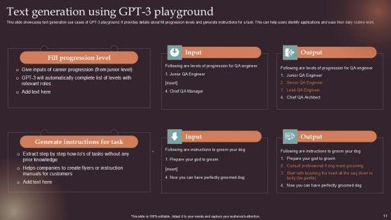 This slide showcases text generation use cases of GPT 3 playground. It provides details about fill progression levels and generate instructions for a task. This can help users identify applications and ease their daily routine work. Find a pre designed and impeccable Comprehensive Resource Guide To Master GPT 3 Text Generation Using GPT 3 Playground Template PDF. The templates can ace your presentation without additional effort. You can download these easy to edit presentation templates to make your presentation stand out from others. So, what are you waiting for Download the template from Slidegeeks today and give a unique touch to your presentation.