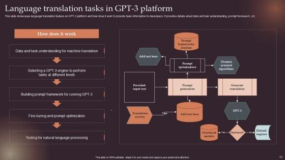 This slide showcases language translation feature on GPT 3 platform and how does it work to provide basic information to developers. It provides details about data and task understanding, prompt framework, etc. The best PPT templates are a great way to save time, energy, and resources. Slidegeeks have 100 percent editable powerpoint slides making them incredibly versatile. With these quality presentation templates, you can create a captivating and memorable presentation by combining visually appealing slides and effectively communicating your message. Download Comprehensive Resource Guide To Master GPT 3 Language Translation Tasks In GPT 3 Platform Rules PDF from Slidegeeks and deliver a wonderful presentation.