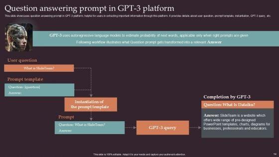 This slide showcases question answering prompt in GPT 3 platform, helpful for users in extracting important information through this platform. It provides details about user question, prompt template, instantiation, GPT 3 query, etc. This Comprehensive Resource Guide To Master GPT 3 Question Answering Prompt In GPT 3 Platform Sample PDF from Slidegeeks makes it easy to present information on your topic with precision. It provides customization options, so you can make changes to the colors, design, graphics, or any other component to create a unique layout. It is also available for immediate download, so you can begin using it right away. Slidegeeks has done good research to ensure that you have everything you need to make your presentation stand out. Make a name out there for a brilliant performance.