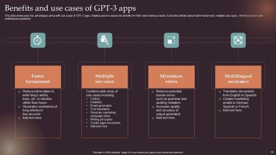 This slide showcases key advantages along with use cases of GPT-3 apps, helping users to assess its benefits for their own business needs. It provides details about faster turnaround, multiple use cases, minimizes errors and multilingual assistance Boost your pitch with our creative Comprehensive Resource Guide To Master GPT 3 Benefits And Use Cases Of GPT 3 Apps Icons PDF. Deliver an awe-inspiring pitch that will mesmerize everyone. Using these presentation templates you will surely catch everyones attention. You can browse the ppts collection on our website. We have researchers who are experts at creating the right content for the templates. So you do not have to invest time in any additional work. Just grab the template now and use them.