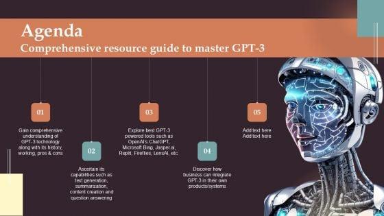 Find a pre designed and impeccable Agenda Comprehensive Resource Guide To Master GPT 3 Portrait PDF. The templates can ace your presentation without additional effort. You can download these easy to edit presentation templates to make your presentation stand out from others. So, what are you waiting for Download the template from Slidegeeks today and give a unique touch to your presentation.