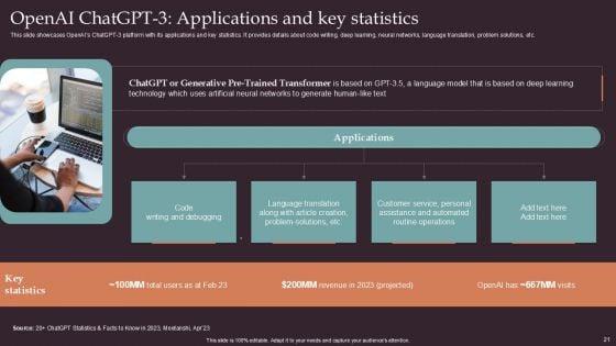 This slide showcases OpenAIs ChatGPT 3 platform with its applications and key statistics. It provides details about code writing, deep learning, neural networks, language translation, problem solutions, etc. Retrieve professionally designed Comprehensive Resource Guide To Master GPT 3 Openai Chatgpt 3 Applications And Key Statistics Clipart PDF to effectively convey your message and captivate your listeners. Save time by selecting pre made slideshows that are appropriate for various topics, from business to educational purposes. These themes come in many different styles, from creative to corporate, and all of them are easily adjustable and can be edited quickly. Access them as PowerPoint templates or as Google Slides themes. You do not have to go on a hunt for the perfect presentation because Slidegeeks got you covered from everywhere.