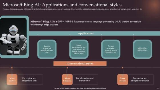 This slide showcases overview of Microsoft Bing AI which explains its applications and conversational styles. It provides details about question answering, image generation, user prompt, content generation, etc. Are you searching for a Comprehensive Resource Guide To Master GPT 3 Microsoft Bing Ai Applications Conversational Styles Guidelines PDF that is uncluttered, straightforward, and original Its easy to edit, and you can change the colors to suit your personal or business branding. For a presentation that expresses how much effort you have put in, this template is ideal. With all of its features, including tables, diagrams, statistics, and lists, its perfect for a business plan presentation. Make your ideas more appealing with these professional slides. Download Comprehensive Resource Guide To Master GPT 3 Microsoft Bing Ai Applications Conversational Styles Guidelines PDF from Slidegeeks today.